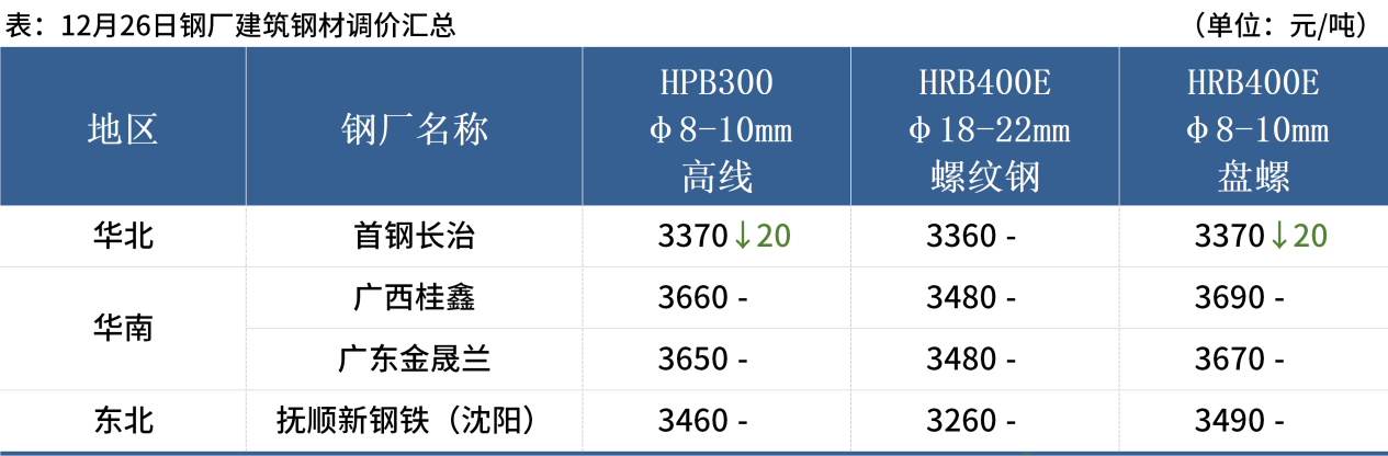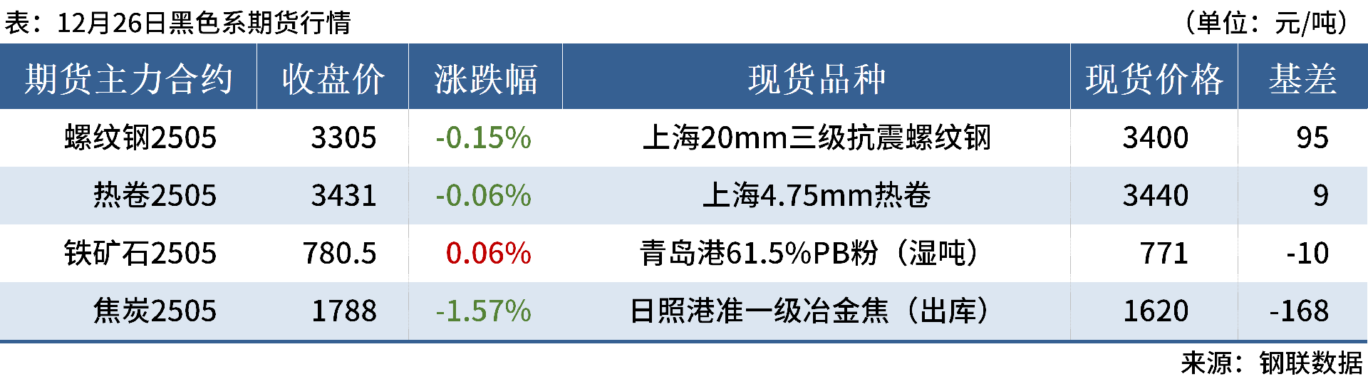 ◎ 截至12月26日,9家鋼廠發(fā)布2024年冬儲政策,其中東北4家,華北2家,西北3家,26日新增加西北1家鋼廠,年化利息5%,收款截止1月24日,4月15日停止計息。詳情>>