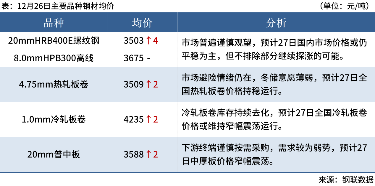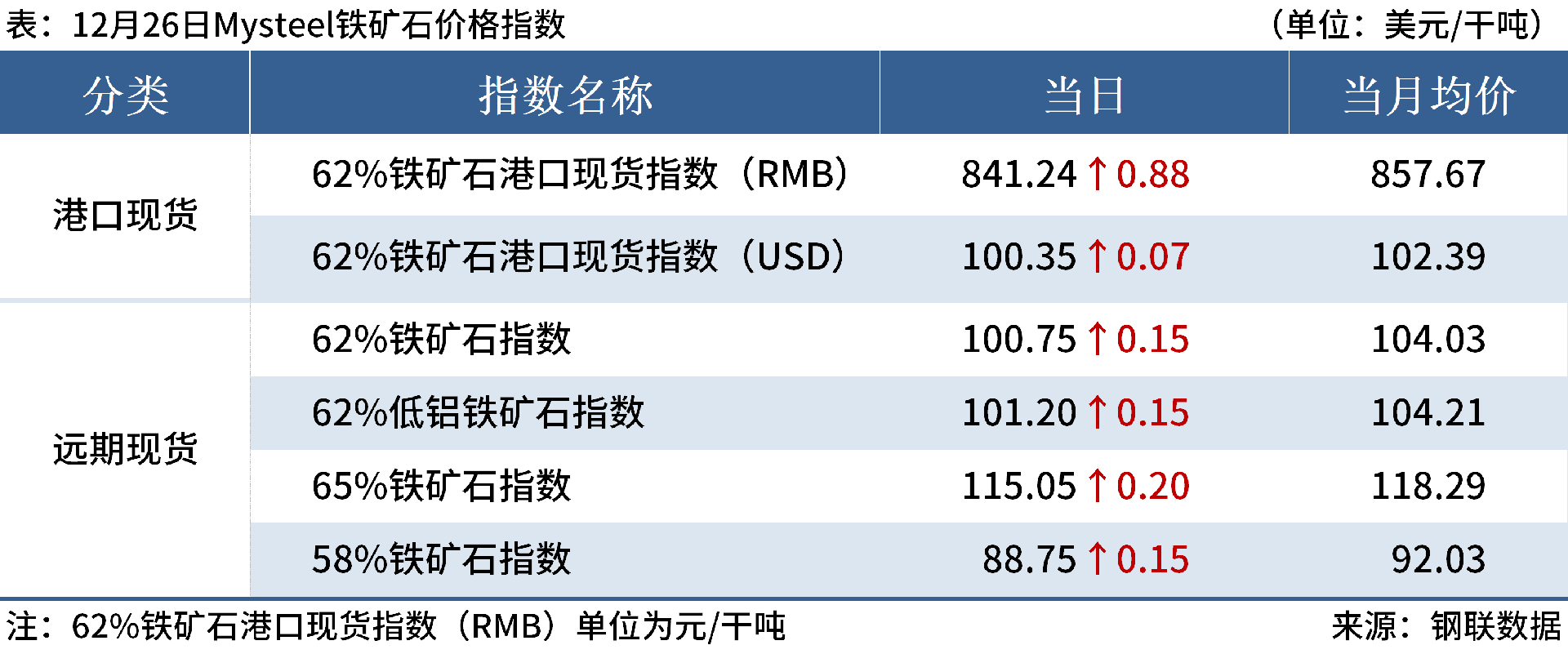 ◎ 12月26日,全國主港鐵礦石成交112.43萬噸,環(huán)比增26.6%;237家主流貿(mào)易商建筑鋼材成交10.64萬噸,環(huán)比增8.4%。