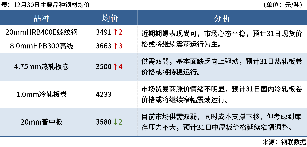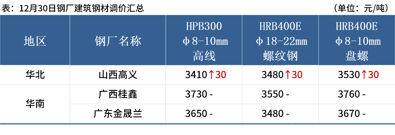 ◎12月30日,唐山遷安普方坯資源出廠含稅上調(diào)20元/噸,報(bào)3050元/噸。