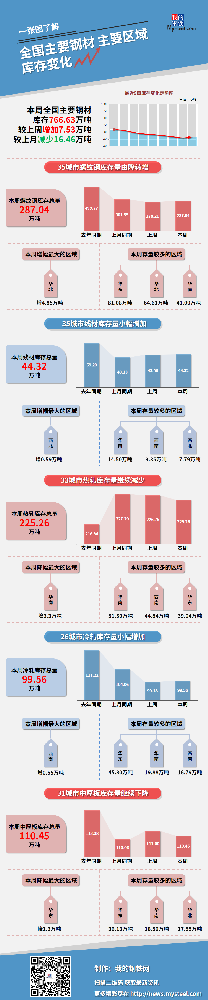 本周,全國主要鋼材社會庫存766.63萬噸,較上周增加7.53萬噸,較上月減少16.46萬噸;螺紋鋼庫存總量287.04萬噸。